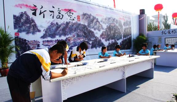(石拐区第一中学小学部的学生现场制作书画展示)