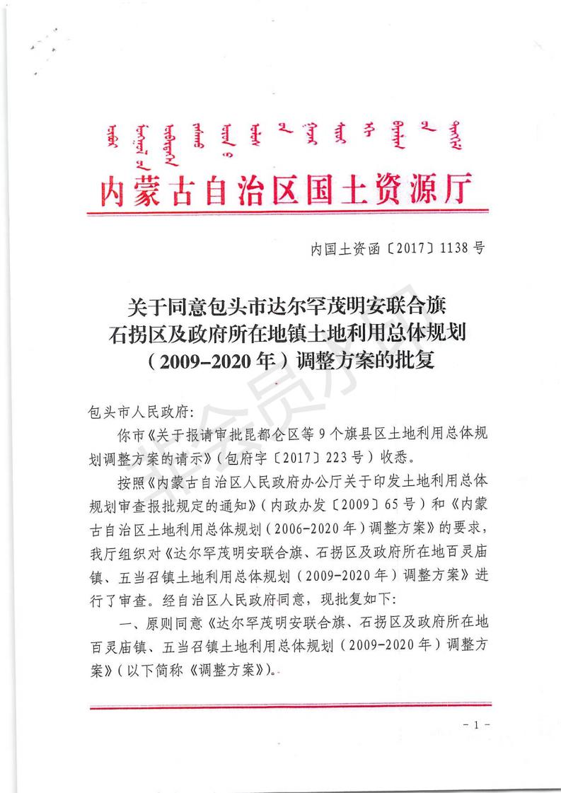 关于同意包头市达茂石拐区及政府所在地镇土地利用总体规划(2009-2020)调整方案的批复